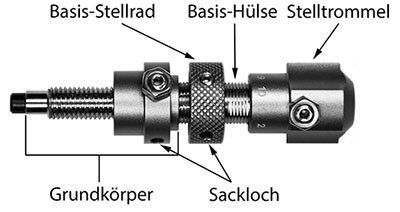 Hierdurch muss der Button nur einmal in den Bogen eingeschraubt werden, und die Tiefe des Buttonstiftes und somit die Lage des Pfeils wird dann ganz leicht über drehen am Basisstellrades rastend eingestellt.